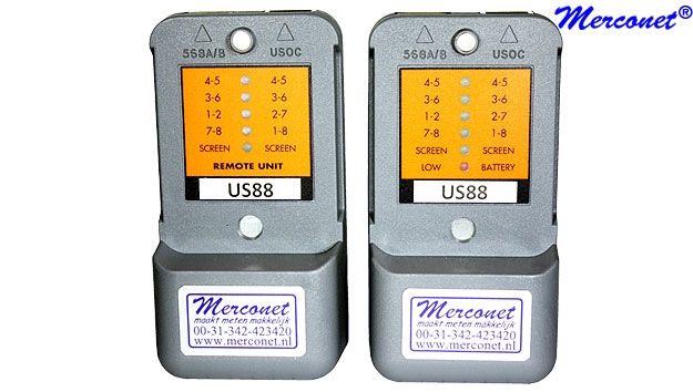 De US88 is een gebouw-bedradings en patchkabeltester, geschikt voor telecombekabeling: PTT norm 88 en ISDN en computerbekabeling: Cat 3 / 6 UTP. Ook alle draden van Cat 5 / 6 STP worden getest. Na het aansluiten, start de US88 automatisch met het testen. Open einden, aderverwisselingen, paarverwisselingen en kortsluitin-gen worden geïdentificeerd. De resultaten van de metingen worden direct met 5 LED's op de loopback adapter en/of zender weergegeven. Per 2 draden is er 1 LED aanwezig. De rode en groene LED's leveren snel en nauwkeurig een duidelijk overzicht van de resultaten. Na gebruik worden de zender en de loopback adapter door magneten aan elkaar gekoppeld. Automatisch wordt dan de batterij uitgeschakeld.