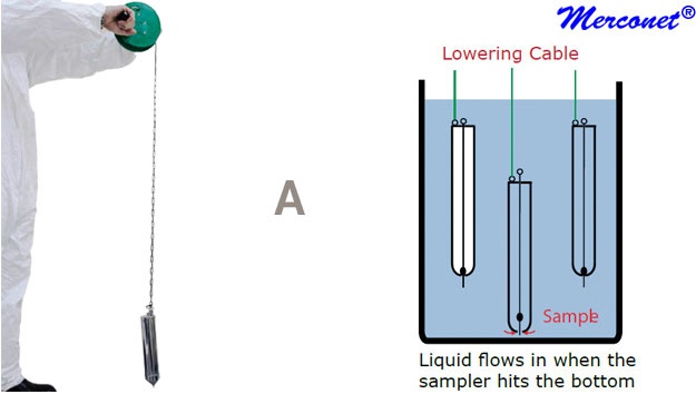 Monstername systeem ANI0 is een dompelfles voor het nemen van vloeistof monsters met twee bediening systemen. 1.) Op een zelf te bepalen diepte. Na het onderdompelen tot de juiste diepte wordt de vloeistof monsterfles geopend door te trekken aan de tweede draad. 2.) Bij bodem monsters met de pin aan de onderzijde welke ingedrukt wordt door een harde bodem. Toepasbaar o.a. zeewater, zoetwater bij milieu monsters van bronnen, sloten en rivieren of olie en olieresten (sludge) in een tank. Dit tot een diepte van 50 meter. De ANI0 is gemaakt van vonk onderdrukkend vernikkeld messing. Het monster is snel over te gieten in een monsterfles zoals de Merconet ANI3 en ANI4. De kabels zijn noodzakelijk voor een juiste werking, dit is geen optie. Verschillende soorten en lengtes zijn leverbaar afhankelijk van de toepassing. RVS ketting, RVS draad, Polypropyleen en Koper voor een EX toepassing. In de lengtes van 10, 25 en 50 meter. Handhaspels zijn er in propyleen of geleidend plastic voor explosie gevoelige EX omgevingen welke voorzien is van een aardingskabel. Gebruik geen RVS kabel in een ATEX (ATmosphères EXplosibles) explosiegevoelige omgeving.